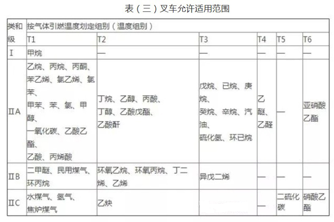 對于I、II區(qū)爆炸性氣體環(huán)境表(三)為叉車允許適用范圍,表(四)為危險區(qū)域的溫度組別劃分。